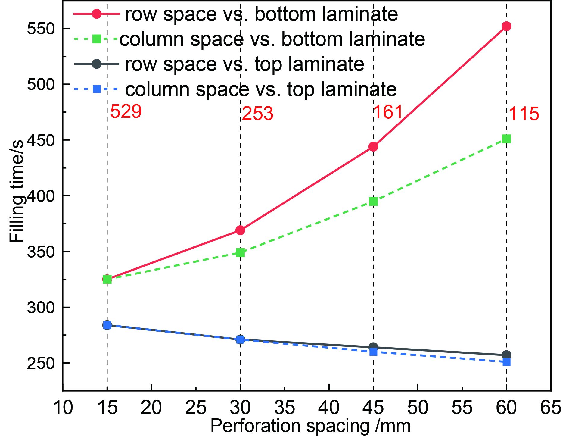 Introducing viscoelastic damping layer into composites is an effective method to improve the composite structural vibration characteristics. The vacuum assisted resin transfer molding (VARTM) process of sandwich composites with perforated silicone rubber was investigated by experiment and simulation. Firstly, the equivalent permeability of fiber reinforced materials and its combination with the flow medium were tested under constant pressure injection conditions. Then, the VARTM platform was set up to observe mold filling experiment in the laboratory. The resin filling model was established based on the RTM-Worx software. The validity of the simulation model was verified by comparing the experimental resin flow diagram and the filling area with simulated results at different time. Finally, the effects of the parameters such as the spacing between columns, the row spacing, the diameter of the holes in the damping layer and the "edge effect" on the resin filling time and the filling process were discussed. The results show that the simulation model can better predict the resin flow behavior, and unreasonable parameters of damping layer can affect the resin flow and even lead to defects.