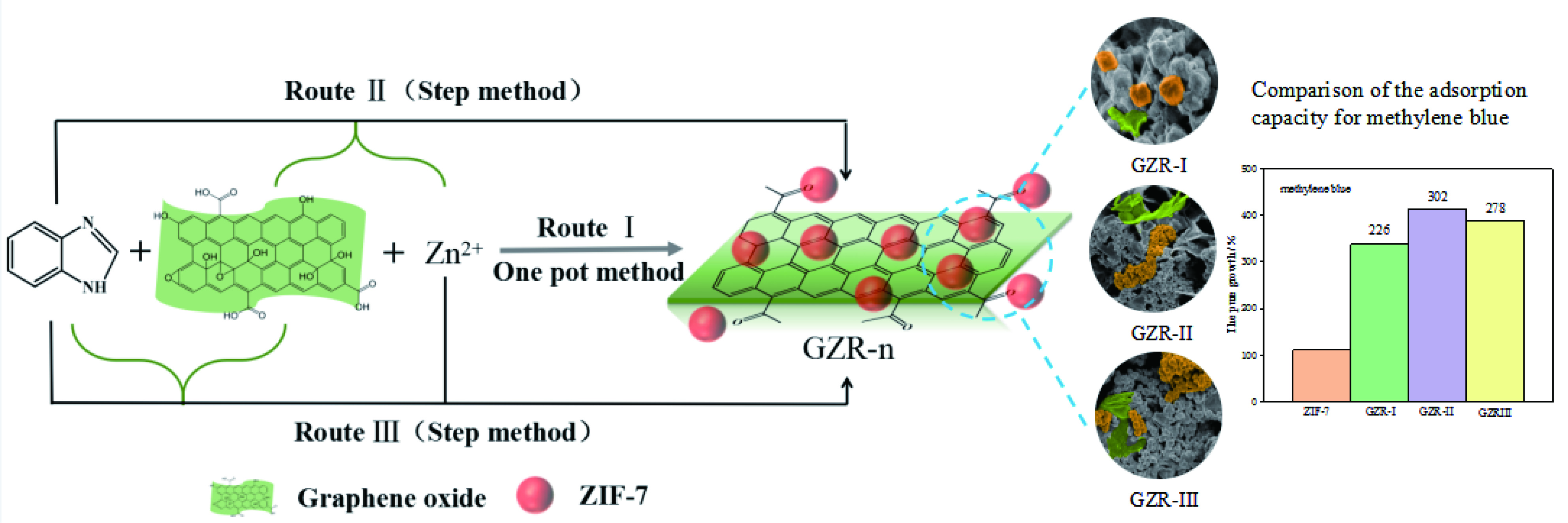 n show good dispersion in methanol and chloroform. Compared with ZIF-7 crystals, the adsorption capacities of GZR-I, GZR-II and GZR-III for methylene blue are increased by 226%, 302% and 278%, respectively. The kinetic simulations indicate that the adsorption of GZR-II and GZR-III for methylene blue are chemisorption and that of GZR-I is physical adsorption.
