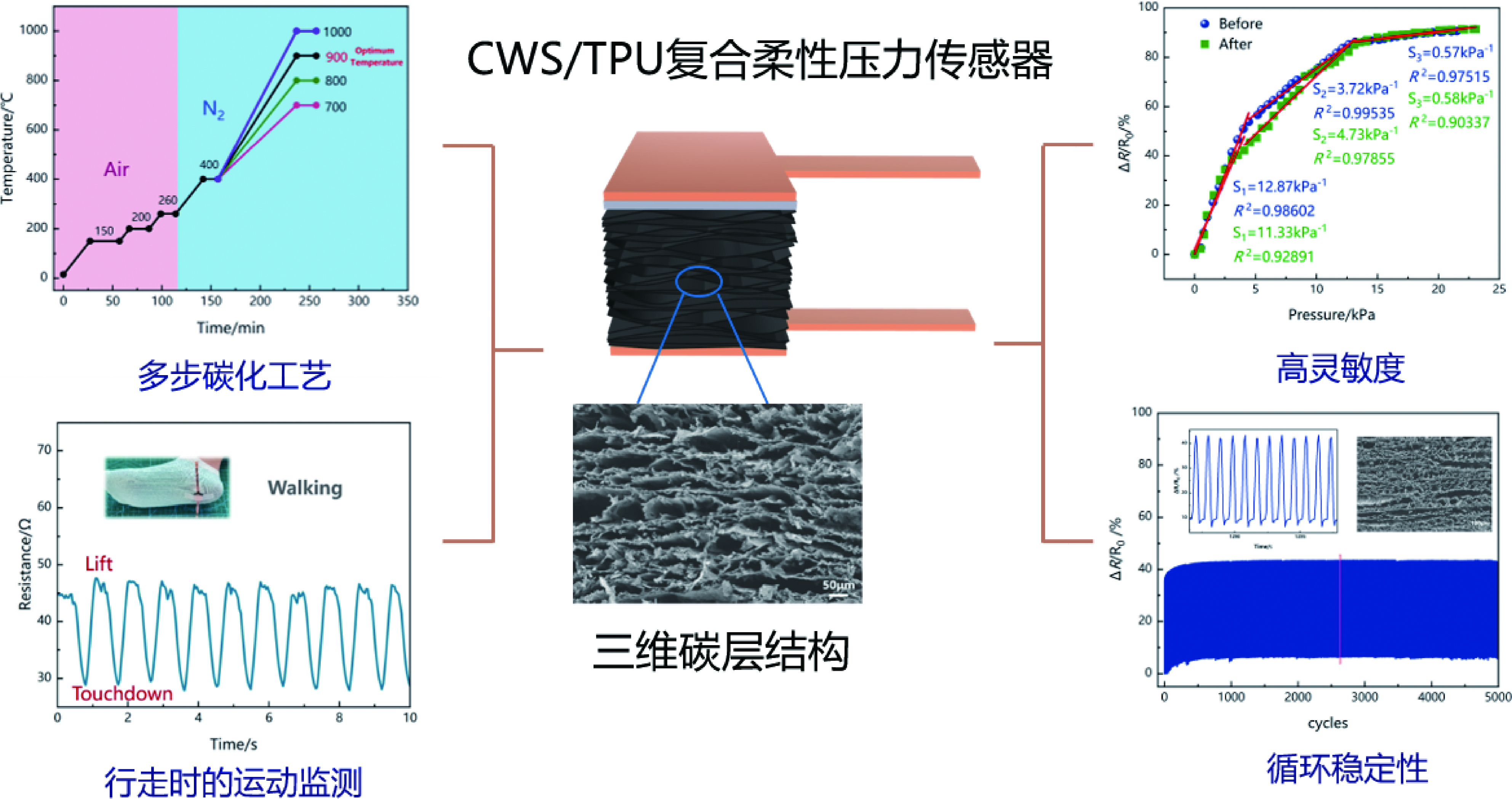 In recent years, flexible pressure sensors with three-dimensional mesh structure show high reversible compressibility and good sensitivity, and their complex network shape is also conducive to the construction of stable conductive network, which is widely used in human health monitoring, wearable devices, medical diagnosis and other fields. In this study, a carbonized wood sponge (CWS)/thermoplastic polyurethane elastomers (TPU) composite pressure sensor with three-dimensional layered structure based on natural balsa wood was designed to construct a stable three-dimensional conductive network and optimize the sensing performance. The catalytic treatment, carbonization process, sensing performance and human applicability of the sensor were characterized. The results show that the carbon yield of the light wood-based CWS/TPU sensor by catalytic treatment and high temperature carbonization can reach 20.15%, the compressive strain can reach at 60%, and the maximum pressure sensing sensitivity can reach 12.87 kPa
