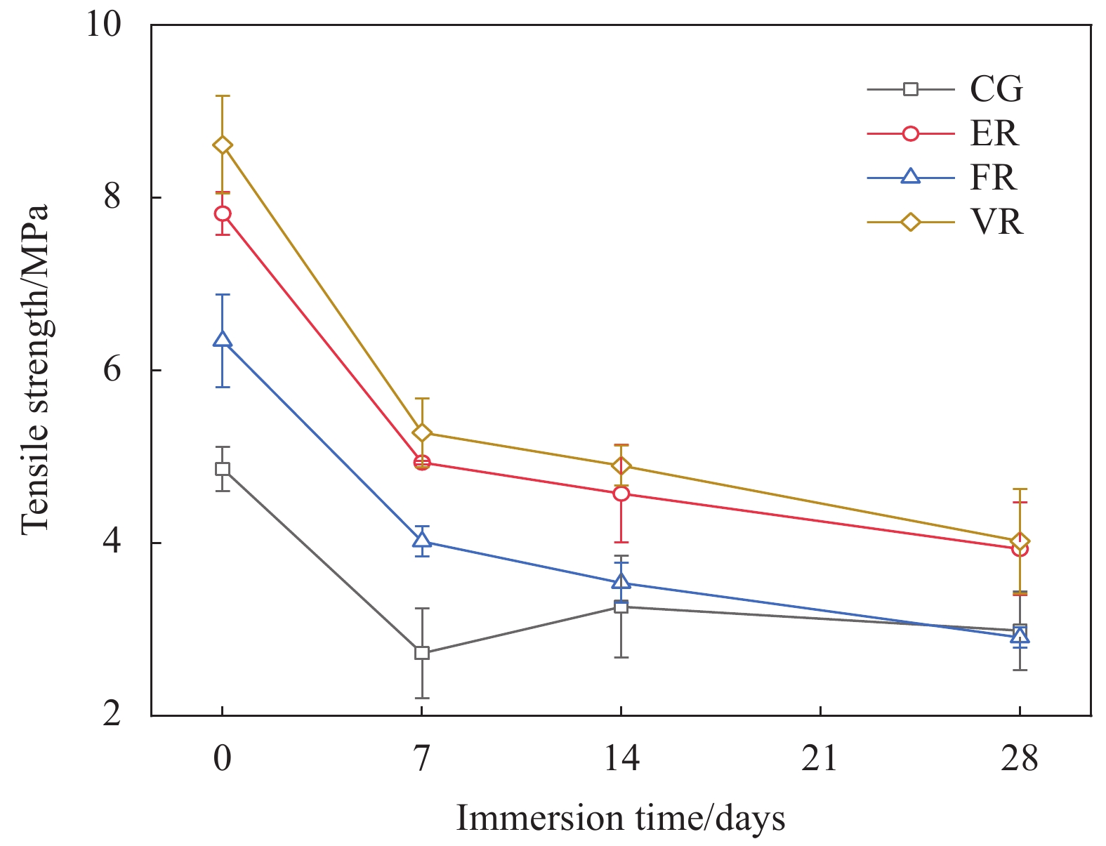 In order to study the effects of different resin (epoxy resin, furan resin, vinyl resin) coatings and seawater immersion on the mechanical properties of basalt textile reinforced seawater sea sand concrete (BTR-SSC), a universal testing machine was used to perform static tensile tests on the fiber yarns of each resin coating and the BTR-SSC specimens immersed in seawater for different time, and the fiber-matrix interface bonding performance was evaluated by pull-out test. The crack and strain distribution were obtained by digital image correlation analysis, and the damage mechanism was analyzed by scanning electron microscopy. The long-term performance of the interface was evaluated by crack distribution and matrix strength through the calculation formula of interface bond strength. The results show that the reinforcing effects of the three resins on the fiber yarns are significant and similar (around 32%), which could significantly improve the mechanical properties of BTR-SSC. The vinyl resin coating had the best performance, and the tensile properties and interfacial bonding properties are increased by 77% and 180%, respectively. The mechanical properties of BTR-SSC specimens are significantly degraded under seawater immersion. The untreated specimens are brittle after 14 days of high temperature immersion. The tensile strength of epoxy resin, furan resin and vinyl resin coated specimens increase by 81%, 48% and 94% respectively after 7 days of immersion compared with untreated specimens. After 28 days of immersion, there are still multiple cracks developed, and the interfacial bonding properties are lost by 64%, 57% and 55%, respectively. The results will help to improve the long-term performance of BTR-SSC in the marine environment and promote its application in marine structures.