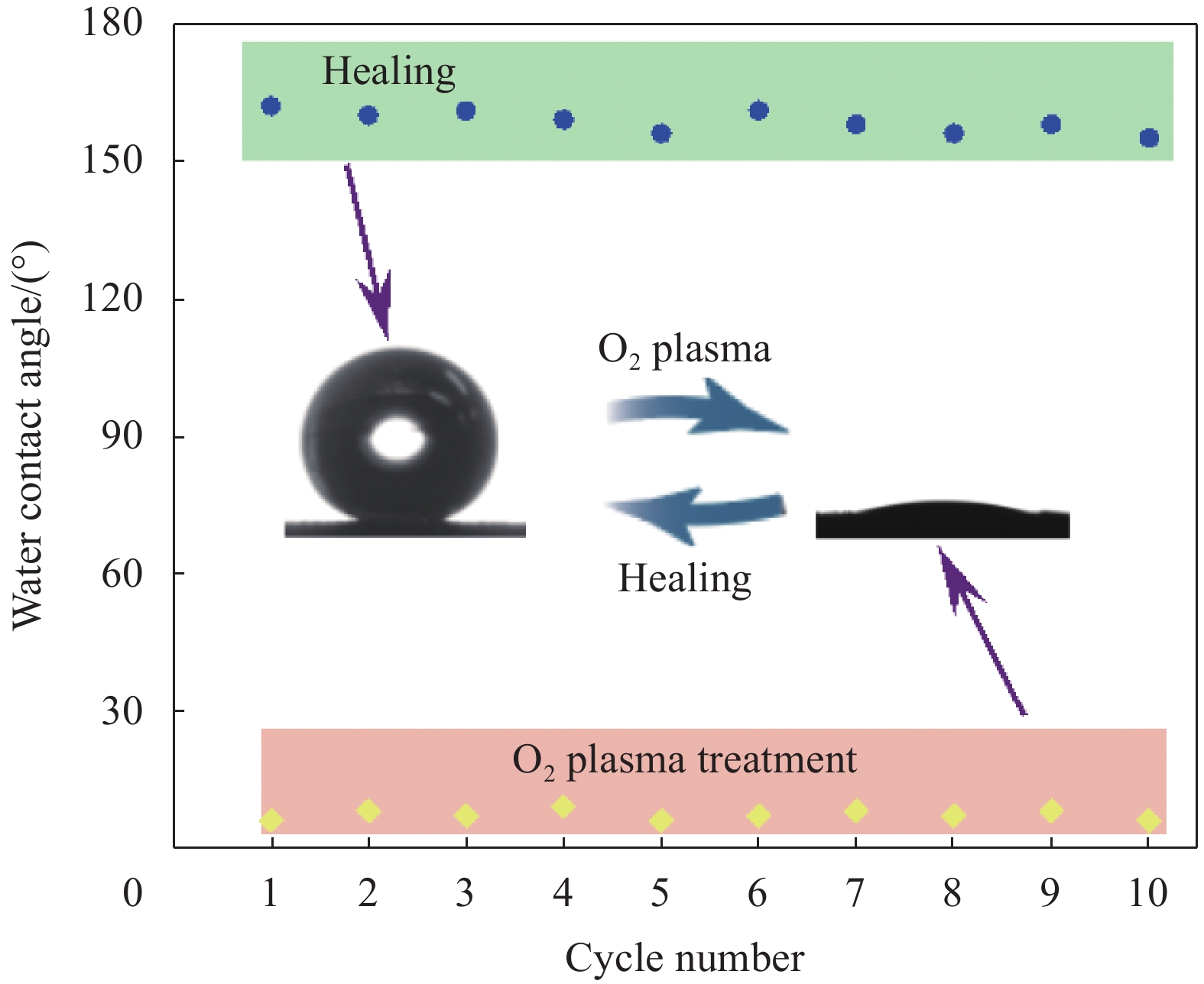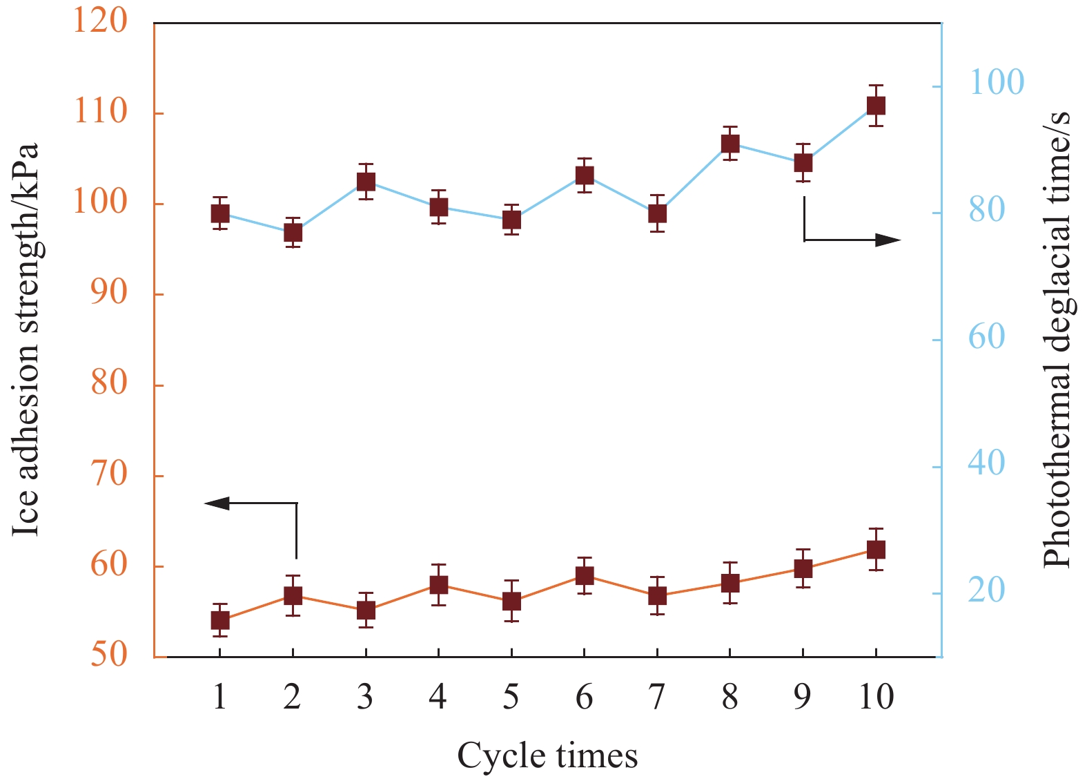 2 infrared illumination. Moreover, the membrane showed strong resistance to chemical damage, retaining a water contact angle of at least 155° after 10 cycles of oxygen plasma etching and repair. In anti-icing tests, the delayed freezing time and ice adhesion strength of PTHSHM is measured as 350 s and 55 kPa. A 20 μL ice droplet melted and rolled off in 77 s under 0.1 W/cm