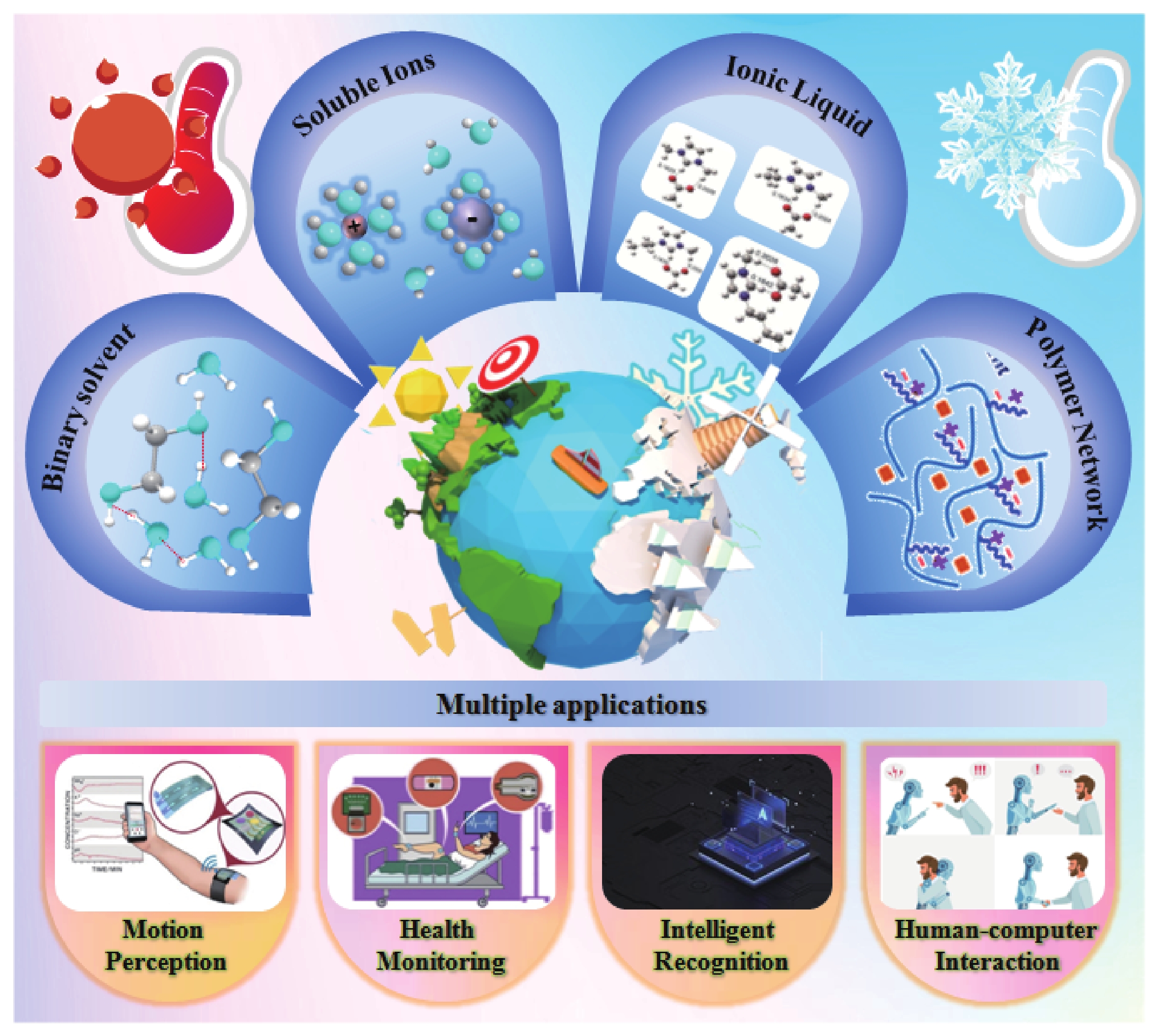 Conductive hydrogel is one novel flexible material with outstanding conductivity, flexibility and skin-friendliness, which has made great progress in flexible electronics recently. However, similar to traditional hydrogels, the applications of conductive hydrogels in extreme environments still face limitations. To extend the operational temperature range of hydrogels, some researchers have paid attention to the dehydration/freezing behavior of hydrogels, resulting in the successful design and fabrication of a series of hydrogels with moisturizing and anti-freezing properties. In this review, the strategies for improving the temperature tolerance of hydrogels are summarized, and the potential mechanisms of moisturizing and anti-freezing hydrogels are described in detail. Furthermore, the applications of environmentally stable hydrogels in the field of flexible electronics are discussed, including motion perception, health monitoring, intelligent recognition and human-computer interaction. Additionally, the opportunities and challenges faced by the moisturizing and anti-freezing hydrogels are deliberated, with the objective of stimulating innovative approaches towards weather-resistant hydrogel development. By advancing the development of modern hydrogels with excellent comprehensive performance, the aim is to facilitate their broader practical application in extreme environments.