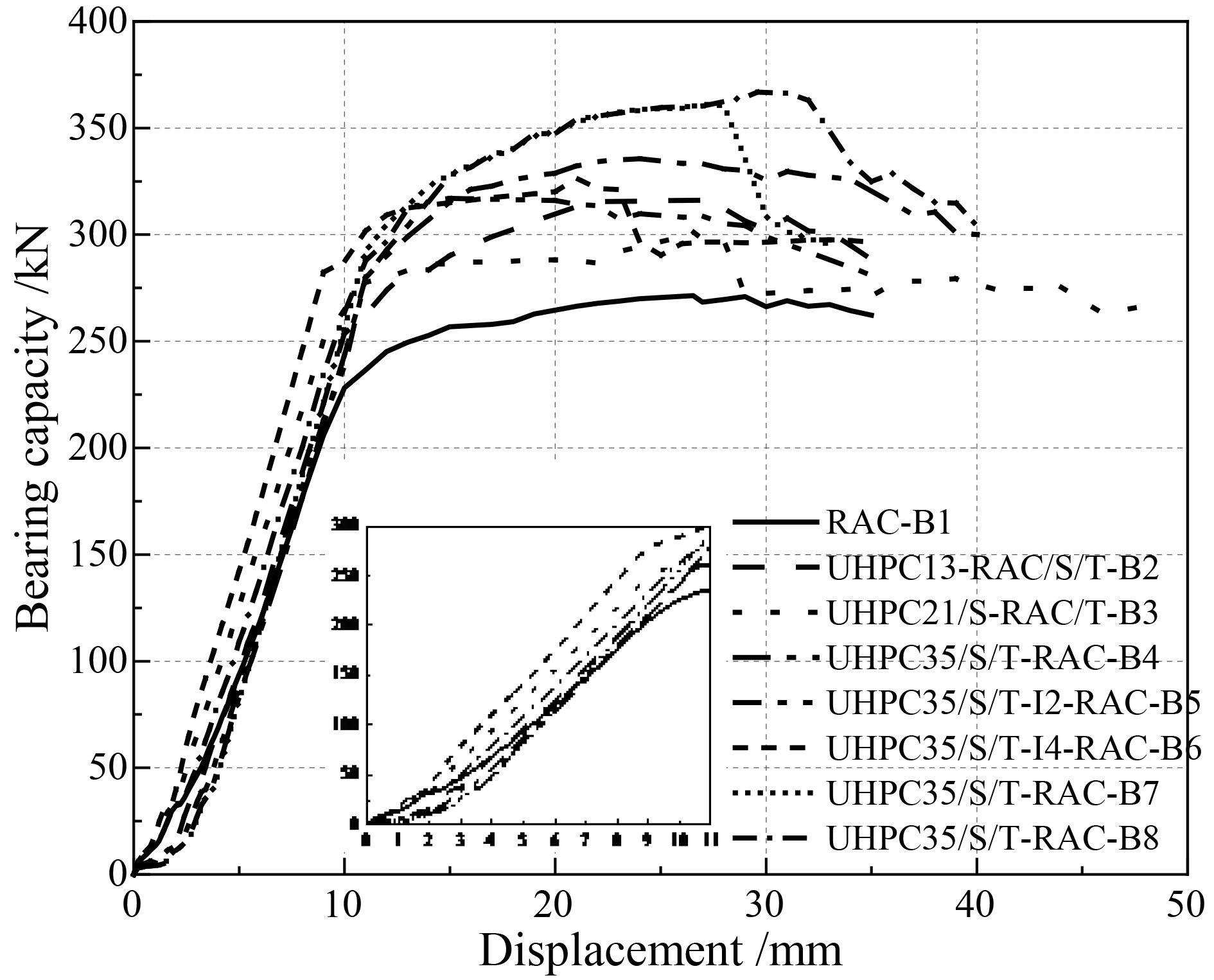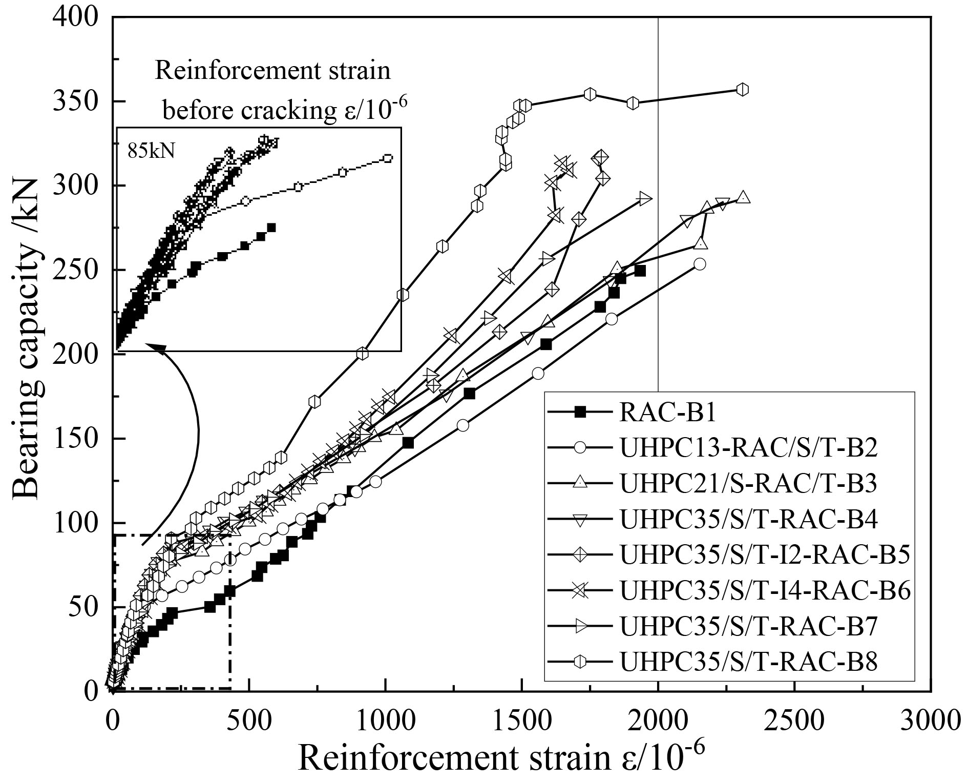 Ultra-high performance concrete (UHPC) and recycled aggregate concrete (RAC), with a low carbon footprint, belong to the "Low Carbon Concrete". A portion of RAC on the tensile side or side wall of the RAC beam was replaced with UHPC to form a "green and low carbon" UHPC-RAC composite section to improve mechanical pro-perties. The precast UHPC-RAC composite beam was fabricated by precast technology. The influences of tensile UHPC thickness, roughness of UHPC-RAC joint surface and UHPC height of side wall on failure mechanism, bearing capacity, deformation and initial stiffness of precast UHPC-RAC composite beams were analyzed by four-point flexural tests, then the calculation formula of bearing capacity were proposed. The results show that, comparing precast UHPC-RAC composite beams with RAC beams, the UHPC-RAC bonding surface traversed by the stirrups with the increase of UHPC thickness on the tensile side limits the peeling off of UHPC after cracking. The increasing roughness of the interface further retards the extension of horizontal cracks and improves the initial stiffness about 16.6%. With the failure of steel fiber pulling out in the UHPC on the tensile side, the load-displacement curves decrease obviously. The precast composite beams still have a high residual strength when the compression concrete is crushed. Compared with RAC beams, the cracking load and ultimate load of precast UHPC-RAC composite beams are increased by 63.1% and 22.9%, respectively, and the section flexural stiffness and initial stiffness are signifi-cantly improved. In the composite section, reinforcement, UHPC and RAC work collaboratively, and the strain changes linearly along the section height, conforming to the assumption of plain section. After equivalent section stress distribution, the calculation formula of the bending capacity of the precast UHPC-RAC composite beams is deduced, and the calculated results are in good agreement with the experimental values.
