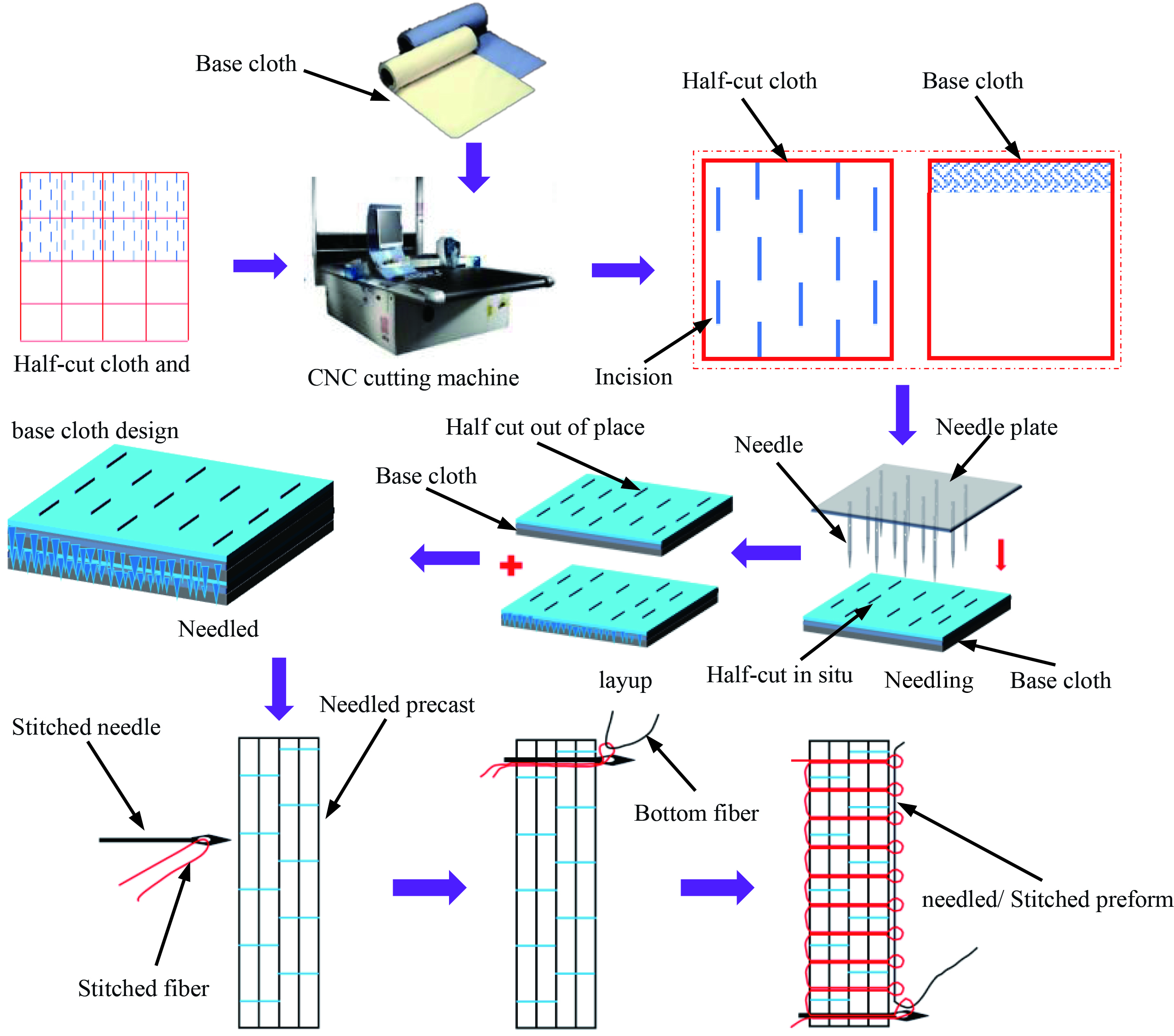 Needled/stitched multi-scale interlocking composites have excellent interlaminar properties and are increasingly used in aerospace thermal structure composites. However, the effect of stitch technology on double incision interlaminar shear (DNS) performance of needle composites remains unclear. Using quartz satin fabric and quartz twill half-cut fabric as materials, quartz fiber-reinforced resin-based needle/stitch multi-scale interlocking composites with three kinds of stitch pattern and four kinds of stitch fiber bundles were designed and prepared. The DNS performance of the composite was tested and analyzed. The internal structure of the fabric was characterized by micro-CT, and the fracture morphology of the sample was observed by scanning electron microscopy (SEM) to clarify the mechanism of interlayer strengthening. The DNS behavior of needled/stitched multi-scale interlocking composites was further investigated by cohesive zone model (CZM) and Abaqus software, and the ultimate failure strength was predicted. The results show that the introduction of stitch technology greatly improves the interlamellar properties of the composite, and the maximum failure load of DNS reaches 32.73 MPa, which is 86.46% higher than that of the needled composite. The main failure modes of multi-scale interlocking composite DNS are matrix cracking, brittle fracture and pulling out of fiber bundle. At the same time, the simulation results are in good agreement with the DNS experimental results of needled/stitched multi-scale interlocking composites, and the maximum error is less than 8%, which proves that the cohesion model established in this paper can effectively predict the interlaminar shear performance of needled/stitched multi-scale interlocking composites.