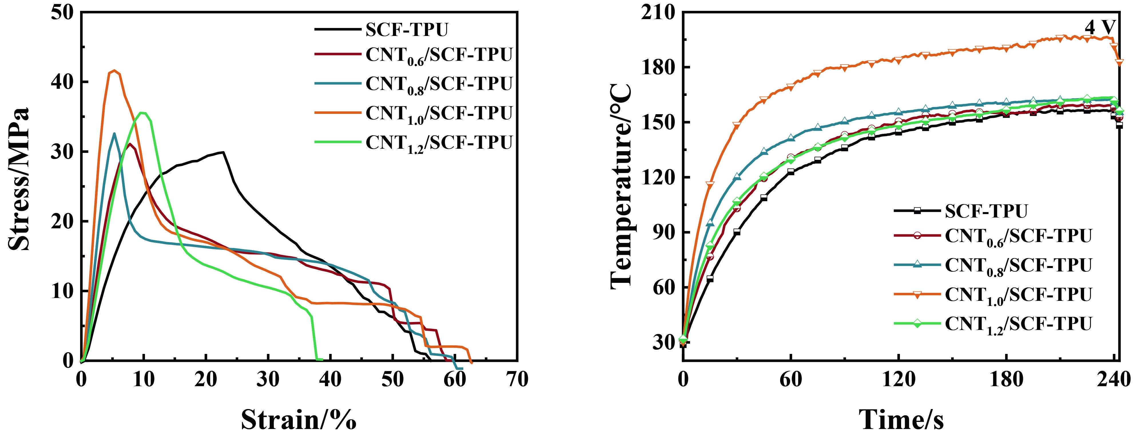 1.0-SCF/TPU composite exhibit significantly improved electrothermal performance at a low voltage of 3.5 V, reaching a temperature of approximately 165℃ in 240 s. It also represents advantages such as precise and stable electrothermal temperature control.