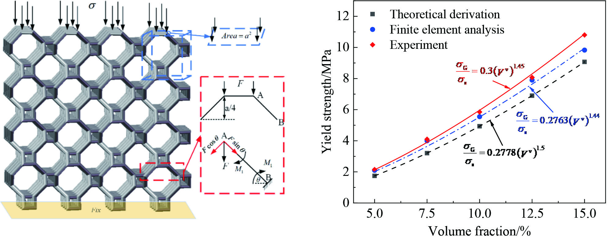 • 摘要: 点阵结构与密实结构存在的力学性能差异之一表现在塑性屈服响应上,因此,研究其屈服行为可为点阵结构的设计和应用提供重要的理论依据。首先,对Gyroid点阵结构进行简化,并基于变形体功能原理建立其力学模型,得到Gyroid点阵结构塑性屈服强度与体积分数之间的映射关系;然后,基于有限元分析软件Abaqus对Gyroid点阵结构准静态压缩过程开展仿真实验,初步验证理论模型的准确性;最后,通过选择性激光熔化(SLM)制备不同体积分数316L不锈钢Gyroid点阵结构,进行单轴压缩实验,分析其变形机制与力学性能。结果表明:理论推导、有限元仿真结果与实验结果相比,误差在25%以内,且根据3种方法结果拟合得到的Gibson-Ashby模型系数具有较好的一致性,表明本文基于理论推导建立的Gyroid点阵结构塑性屈服强度预测模型的有效性。理论模型的构建方法可以转化到其他复杂类型点阵结构中,为快速核算点阵结构力学性能,并将其应用在工程装备中提供理论依据。