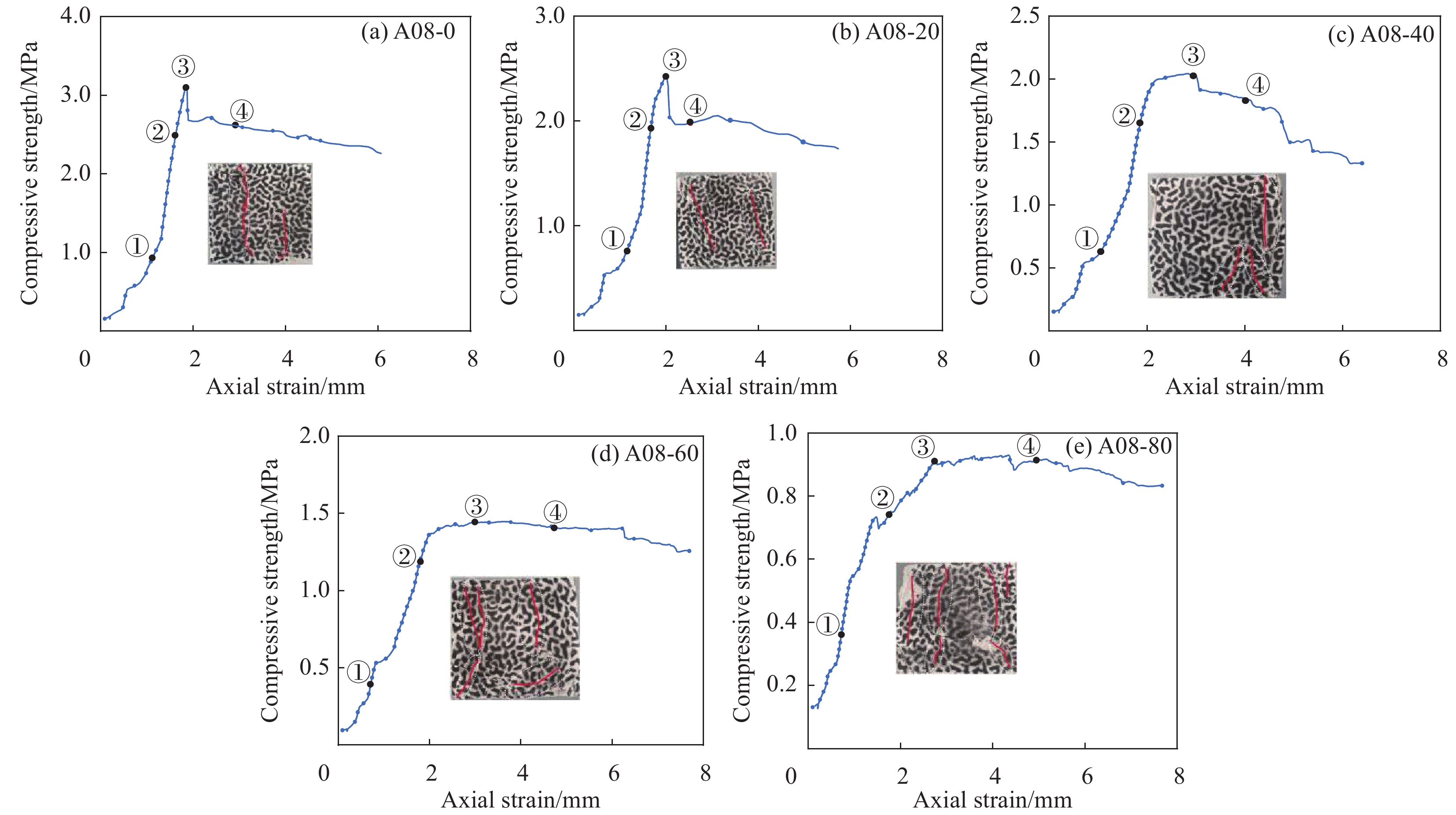 3. The strain evolution cloud diagram and acoustic emission parameter change characteristics of the foam concrete during the loading process were obtained. The results show that the compression damage process curve of foam concrete presents an obvious staged effect. The more freeze-thaw cycles the specimen experiences, the more pronounced the ductile damage characteristics become. With the increase in the number of freeze-thaw cycles, the area of the strain concentration zone of the specimen monitored by the DIC gradually increases, while the average value of the strain field gradually decreases. Meanwhile, the morphology of surface cracks in the specimen evolves from initial vertical single cracks to tilted shear-type multi-fractures. The proportion of shear cracks in the final damage of foam concrete specimens with 0, 20, 40, 60, and 80 freeze-thaw cycles are 52.5%, 57.8%, 59.2%, 65.3%, and 69.2%, respectively. The stages of decreasing acoustic emission