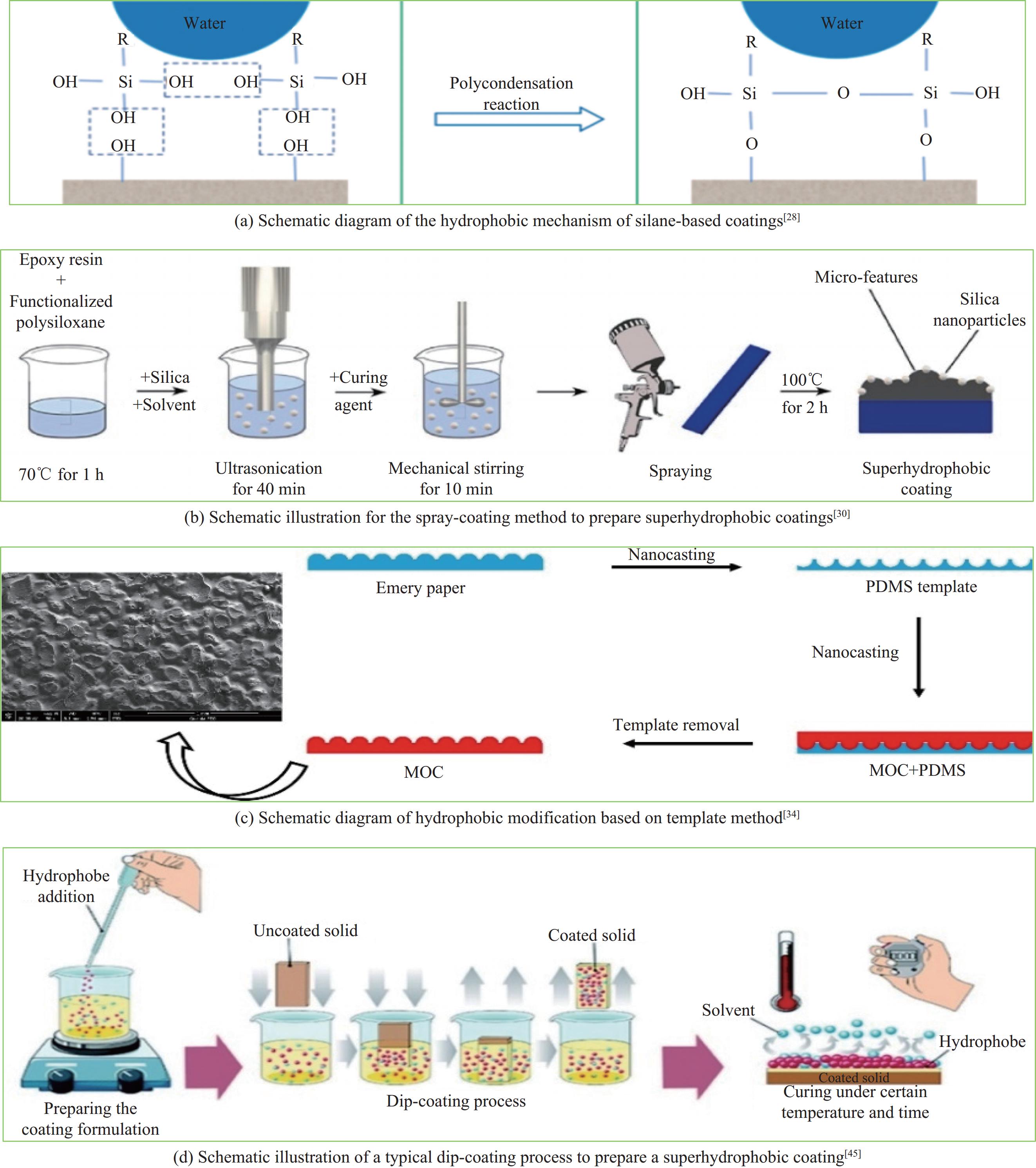 The long-term durability of concrete is one of the main problems it faces, and the main cause of durability damage is the migration of water in the porous structure of concrete, which makes it easier for harmful ions to enter the interior of the substrate. Modifying the cement and geopolymer with superhydrophobic materials is a valid method to avoid the transmission of water, thereby preventing the migration of harmful ions and increased its durability of concrete. This review summarizes the superhydrophobic modification methods of cement and geopolymer cementitious materials and categorized into superhydrophobic surface and bulk modification. The modification mechanism of superhydrophobic modifier added to cement and geopolymer and their bonding mode with inorganic matrix in the internal modification method. Besides, the modification methods commonly used for surface modification in the present research are summarized, divided into external coating, maceration, template method, etc., and the surface modification mechanism is analyzed. Compared with the superhydrophobic composite coatings, the monolithically modified cement and geopolymer matrix composites have greater advantages in practical application scenarios. In addition, the effects of hydrophobic modification on the wettability, waterproofing, compressive properties and anti-corrosion properties of composites are concluded, and their compressive strength was reduced by about 20%-60%. Finally, some problems in the research of hydrophobic modification of cement and geopolymer composites are described and the future research direction is prospected, and it is suggested to carry out research on volumetric super-hydrophobicity, improvement of compressive strength, cost control, and homogeneous dispersion of hydrophobic admixture inside the material.
