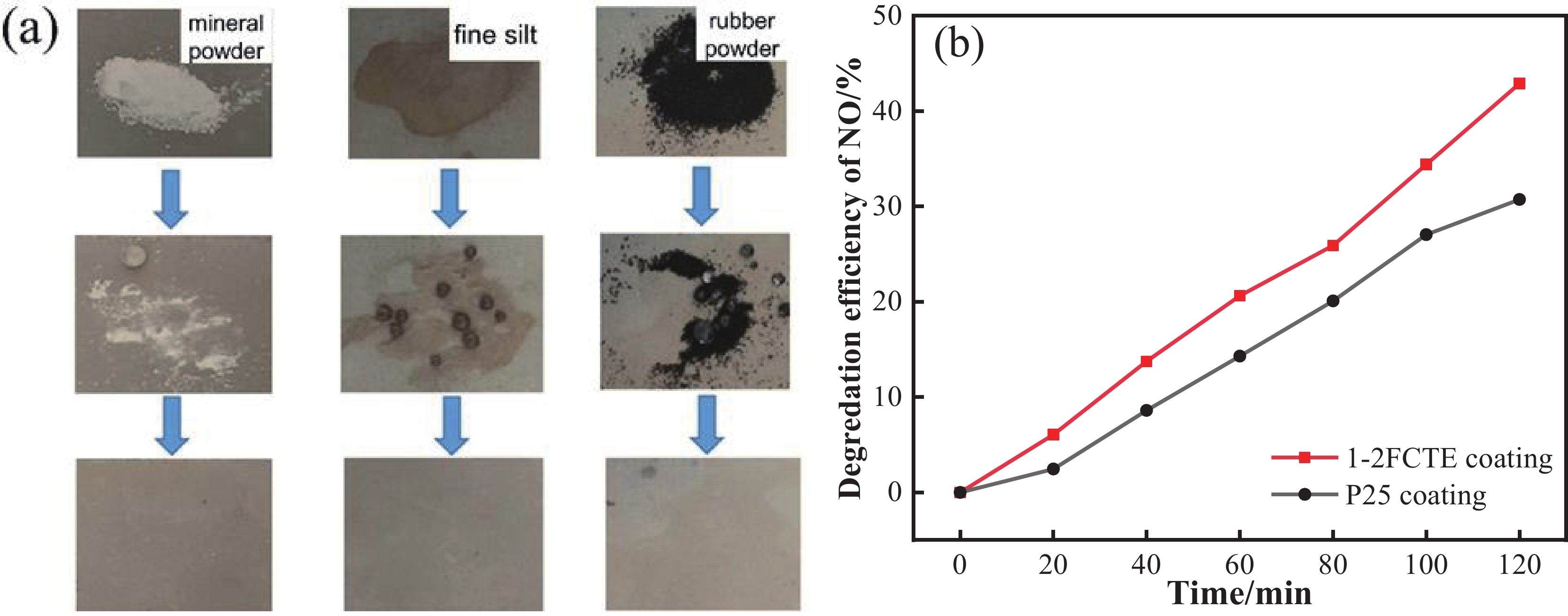 2 nanotubes (TNs). Secondly, a super hydrophobic self-cleaning photocatalyst coating was prepared by spraying epoxy resin as the film matrix, introducing low surface energy components and using the above photocatalyst as the photo active component. The microstructure, chemical composition and optical properties of the composite photocatalyst were characterized by SEM, XRD, XPS, Brunauer-Emmett-Teller calculation (BET), PL and UV-Vis, and the NO photodegradation performance was investigated. The microstructure, self-cleaning property and durability of the coating were systematically studied by SEM-EDS, ash adhesion resistance test, UV aging test, water flushing test, sandpaper abrasion test, and the photodegradation property and cyclic degradation performance of NO were also studied. The results show that the coating has good self-cleaning performance and durability, the NO degradation rate reaches 42.9%. Due to its good cycle stability, the coating is expected to be applied to the degradation of NO in tunnels and other semi enclosed environments.