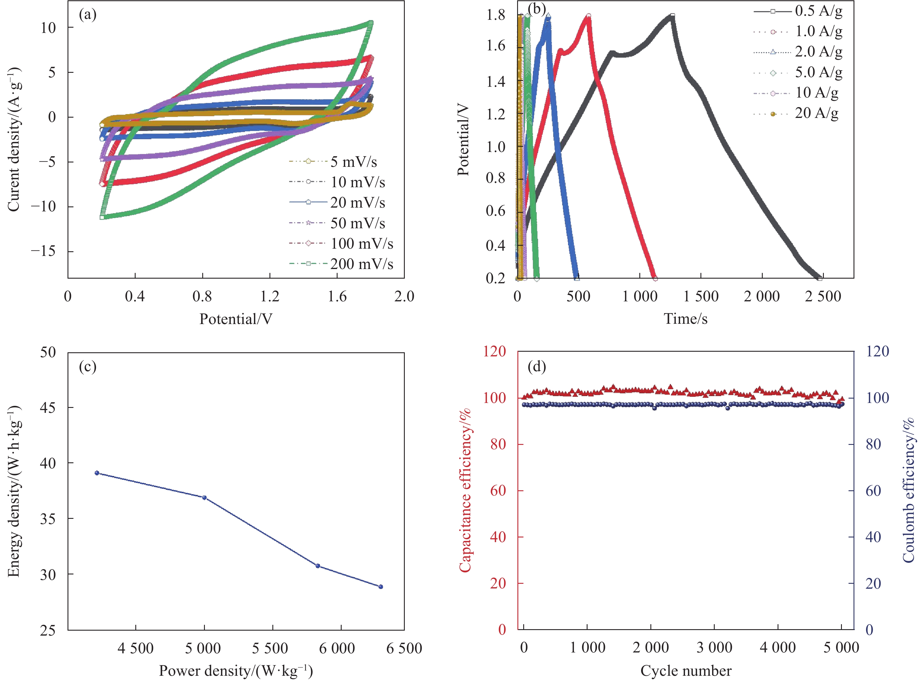 3/g. Electrochemical tests show that electrode displayed excellent specific capacitance of 401.5 F/g at a current density of 0.5 A/g and 264 F/g at a current density of 20 A/g, which revealed good rate capability. Meanwhile, ZHSC reaches 74.2 mA·h/g, energy density is 39.1 W·h/kg and power density is